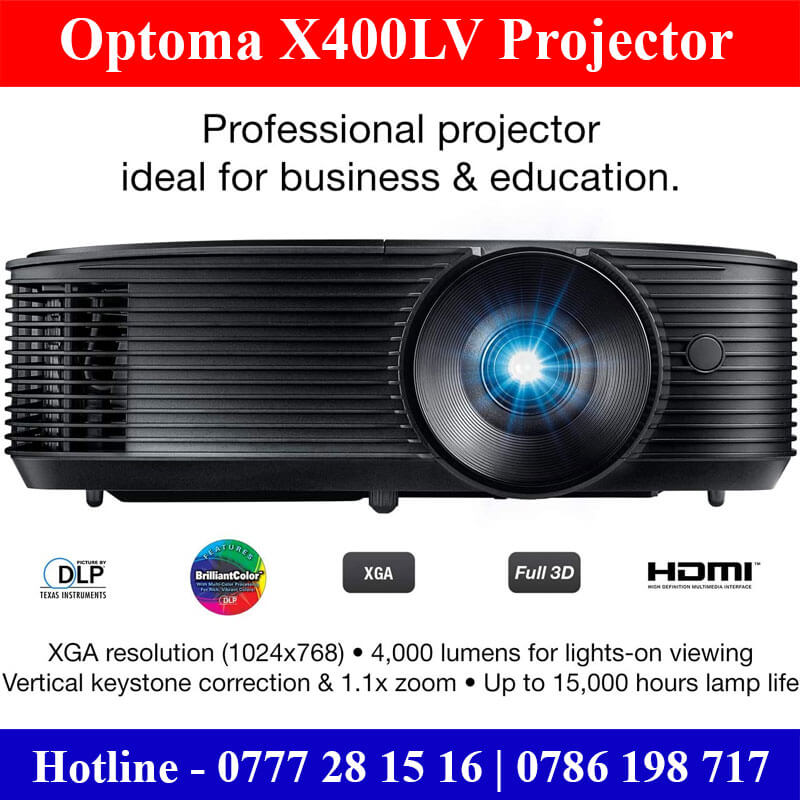 Optoma X400LV Projector Sri Lanka discount price with 02 year warranty. This Optoma X400LV projector with 4000 Lumens. Very good outdoor projector for Class Rooms, Meeting Rooms, Presentation, Movies and Games. Island wide delivery available. Projector lamp life up to 15,000 hours.